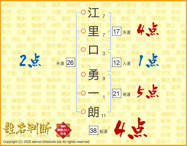 江(7画)里(7画)口(3画) 勇(9画)一(1画)朗(11画)