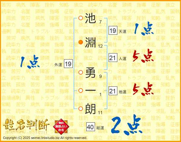 池(7画)淵(12画) 勇(9画)一(1画)朗(11画)