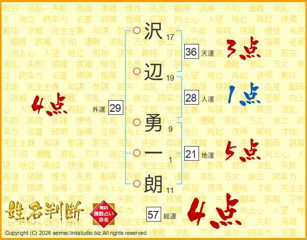 沢(17画)辺(19画) 勇(9画)一(1画)朗(11画)