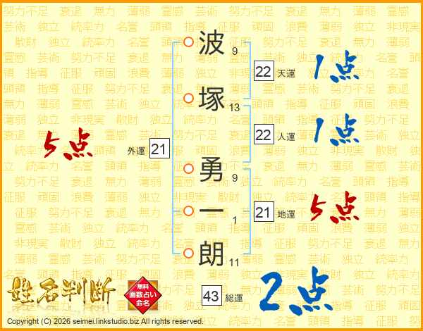 波(9画)塚(13画) 勇(9画)一(1画)朗(11画)
