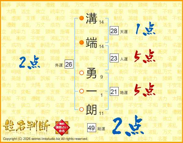 溝(14画)端(14画) 勇(9画)一(1画)朗(11画)