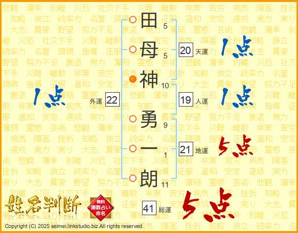 田(5画)母(5画)神(10画) 勇(9画)一(1画)朗(11画)