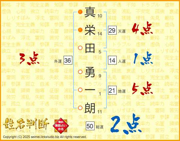 真(10画)栄(14画)田(5画) 勇(9画)一(1画)朗(11画)
