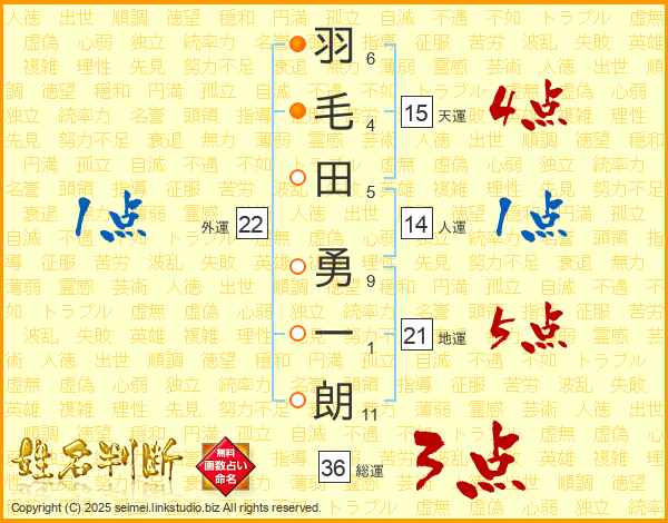 羽(6画)毛(4画)田(5画) 勇(9画)一(1画)朗(11画)