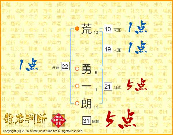 荒(10画) 勇(9画)一(1画)朗(11画)