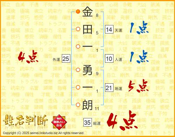 金(8画)田(5画)一(1画) 勇(9画)一(1画)朗(11画)