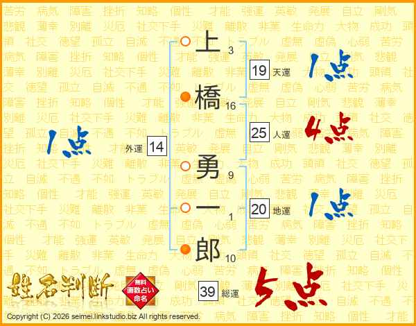 上(3画)橋(16画) 勇(9画)一(1画)郎(10画)