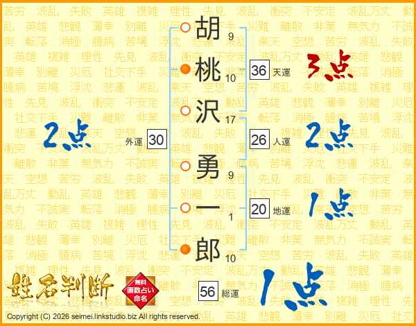 胡(9画)桃(10画)沢(17画) 勇(9画)一(1画)郎(10画)