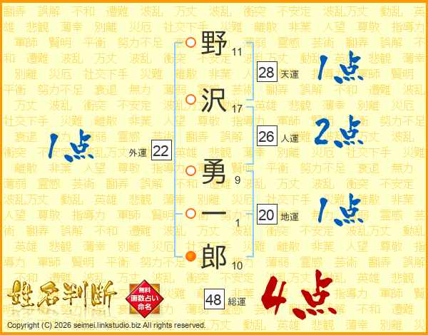 野(11画)沢(17画) 勇(9画)一(1画)郎(10画)