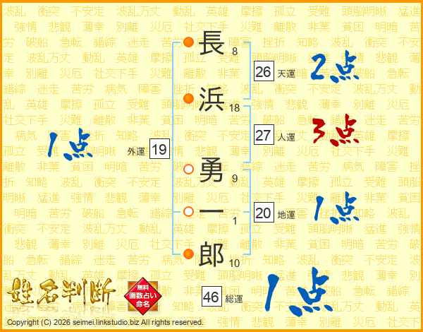 長(8画)浜(18画) 勇(9画)一(1画)郎(10画)
