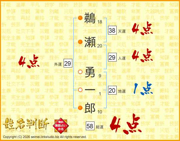 鵜(18画)瀬(20画) 勇(9画)一(1画)郎(10画)