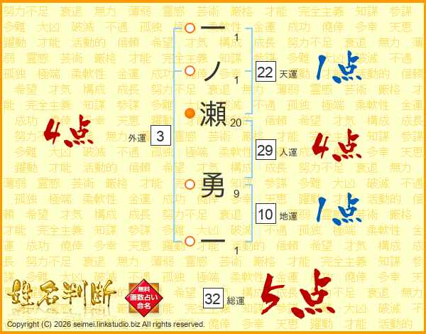 一ノ瀬勇一さんの総運は32画の5点!