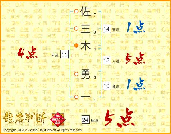 佐(7画)三(3画)木(4画) 勇(9画)一(1画)