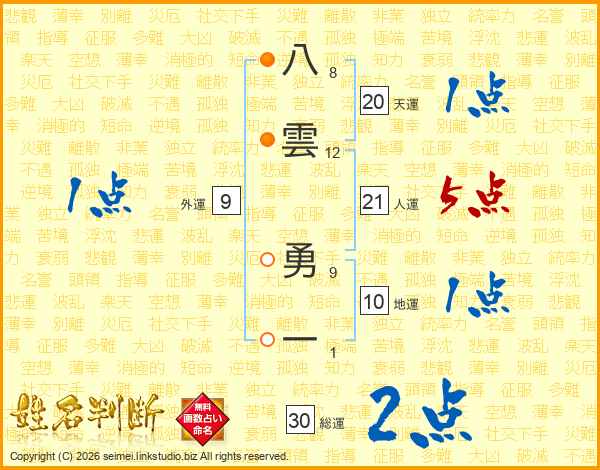 八雲勇一さんの人運は21画の5点!