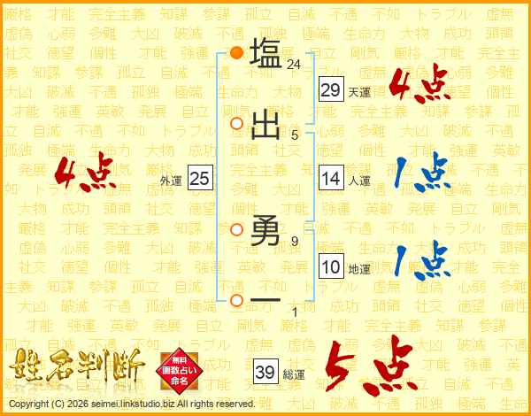 生活面を象徴する運勢です。外部から受ける影響力を表し、結婚運、家庭運や職場、環境への順応性を表します。総運から人運を引いた画数。姓や名が1文字の場合を除く。