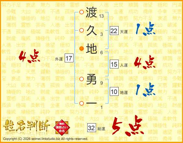 渡(13画)久(3画)地(6画) 勇(9画)一(1画)