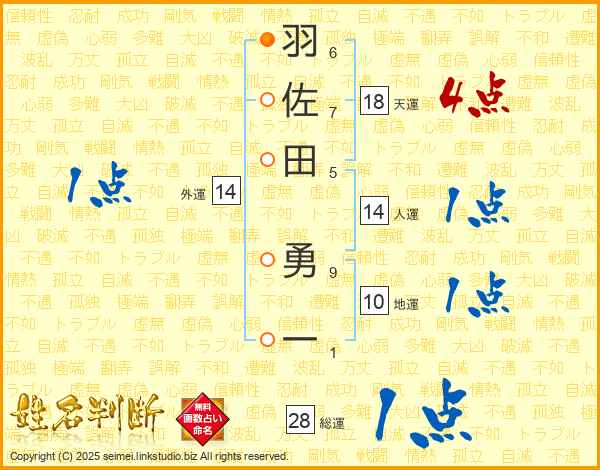 羽(6画)佐(7画)田(5画) 勇(9画)一(1画)