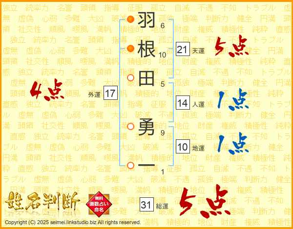 羽(6画)根(10画)田(5画) 勇(9画)一(1画)