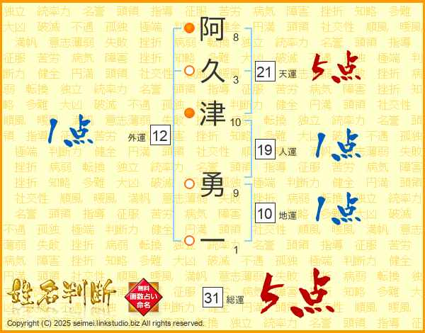 阿(8画)久(3画)津(10画) 勇(9画)一(1画)