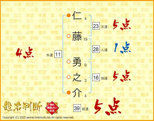 仁(4画)藤(19画) 勇(9画)之(3画)介(4画)