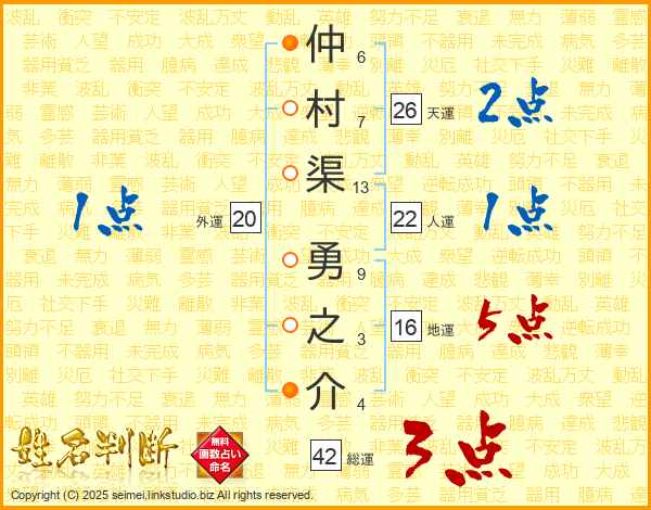 仲(6画)村(7画)渠(13画) 勇(9画)之(3画)介(4画)