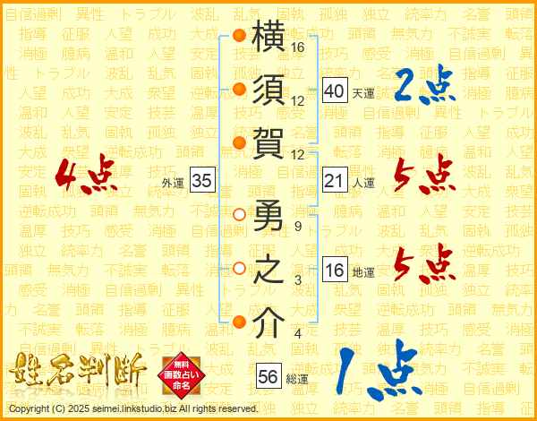横(16画)須(12画)賀(12画) 勇(9画)之(3画)介(4画)