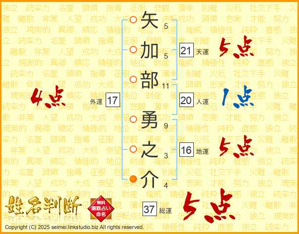 矢(5画)加(5画)部(11画) 勇(9画)之(3画)介(4画)