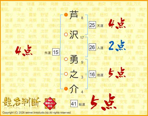 芦(8画)沢(17画) 勇(9画)之(3画)介(4画)