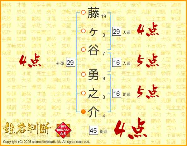 藤ヶ谷勇之介さんの総運は45画の4点!