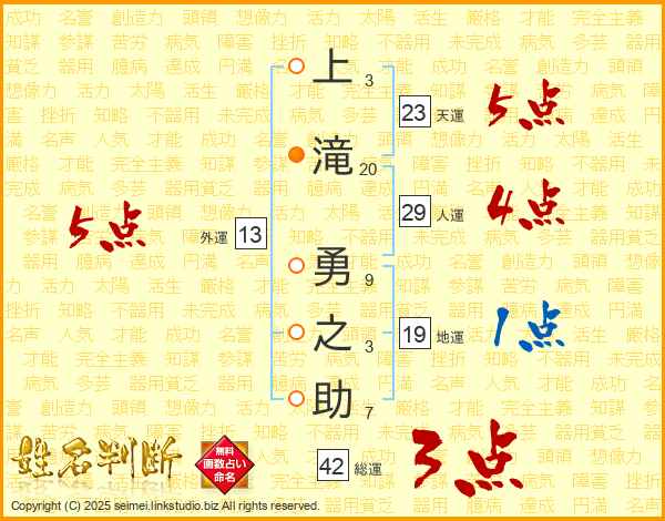 上(3画)滝(20画) 勇(9画)之(3画)助(7画)