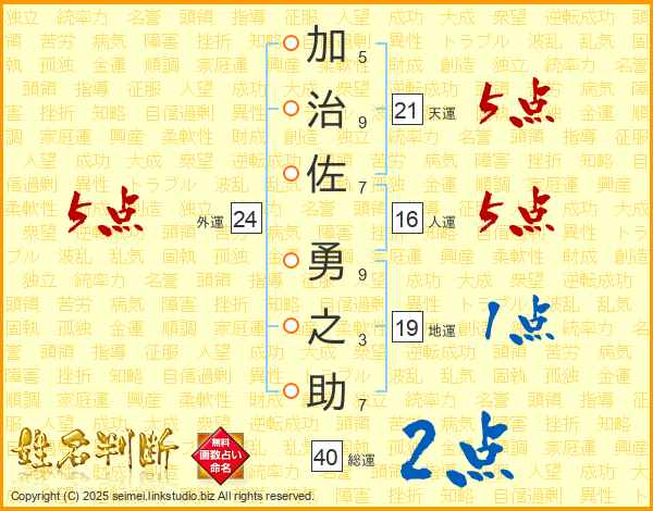 加(5画)治(9画)佐(7画) 勇(9画)之(3画)助(7画)