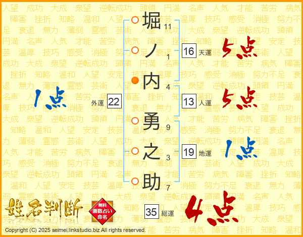 堀(11画)ノ(1画)内(4画) 勇(9画)之(3画)助(7画)