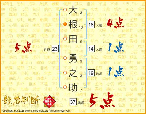 大(3画)根(10画)田(5画) 勇(9画)之(3画)助(7画)