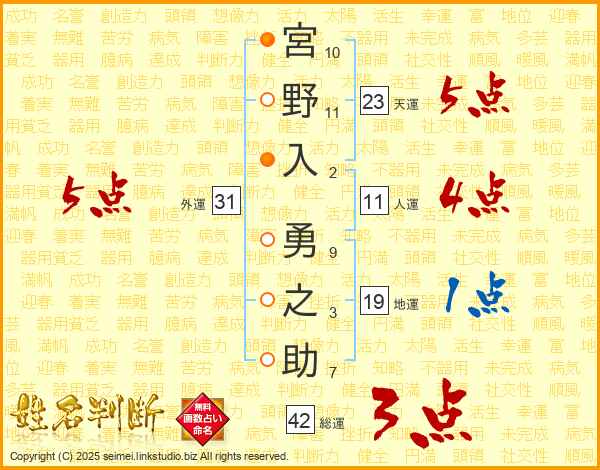 宮(10画)野(11画)入(2画) 勇(9画)之(3画)助(7画)