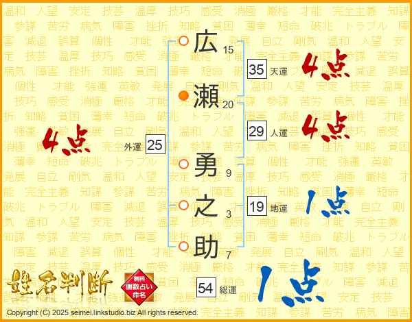 広(15画)瀬(20画) 勇(9画)之(3画)助(7画)