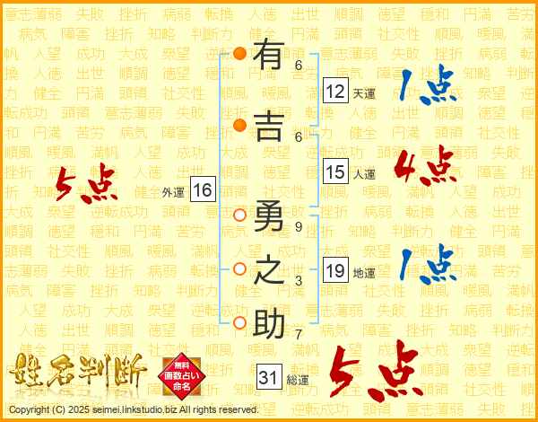 有(6画)吉(6画) 勇(9画)之(3画)助(7画)