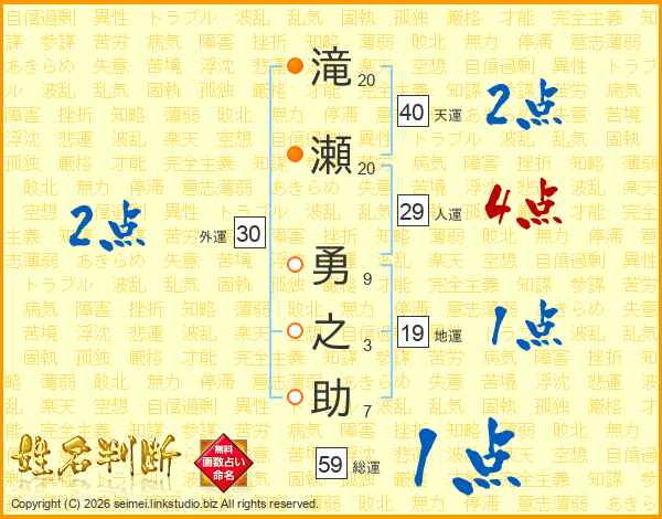 滝(20画)瀬(20画) 勇(9画)之(3画)助(7画)
