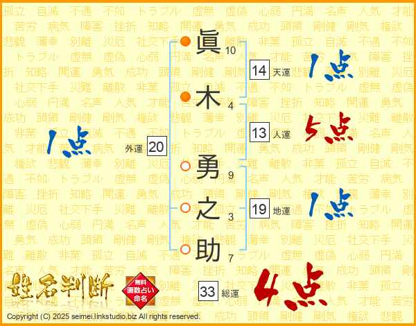 眞(10画)木(4画) 勇(9画)之(3画)助(7画)