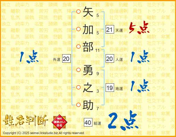 矢(5画)加(5画)部(11画) 勇(9画)之(3画)助(7画)
