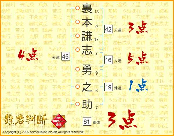 裏(13画)本(5画)謙(17画)志(7画) 勇(9画)之(3画)助(7画)
