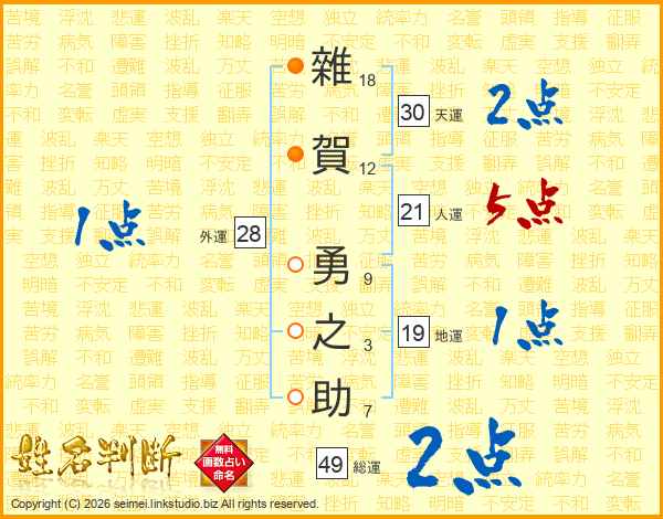 雜(18画)賀(12画) 勇(9画)之(3画)助(7画)