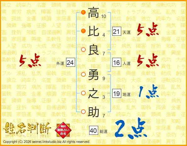 高(10画)比(4画)良(7画) 勇(9画)之(3画)助(7画)
