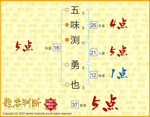 五(5画)味(8画)渕(12画) 勇(9画)也(3画)