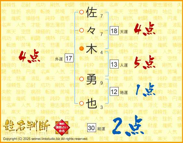 佐(7画)々(7画)木(4画) 勇(9画)也(3画)