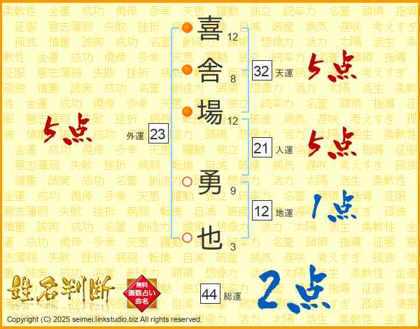 喜(12画)舎(8画)場(12画) 勇(9画)也(3画)