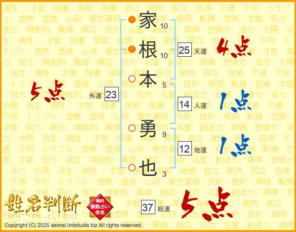 家(10画)根(10画)本(5画) 勇(9画)也(3画)