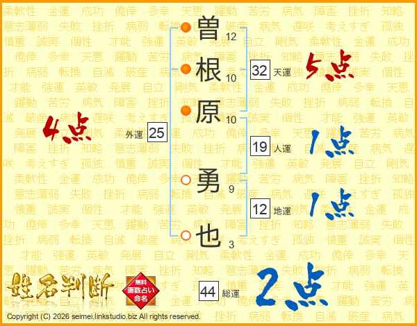 曽(12画)根(10画)原(10画) 勇(9画)也(3画)