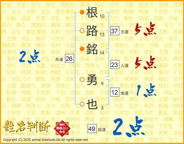 根(10画)路(13画)銘(14画) 勇(9画)也(3画)