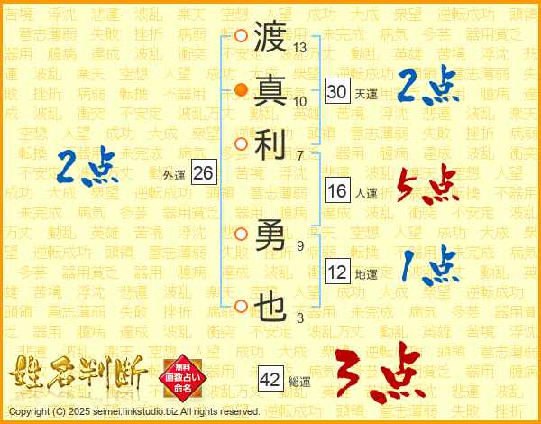 渡(13画)真(10画)利(7画) 勇(9画)也(3画)