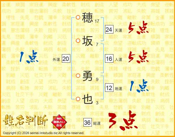 穂(17画)坂(7画) 勇(9画)也(3画)